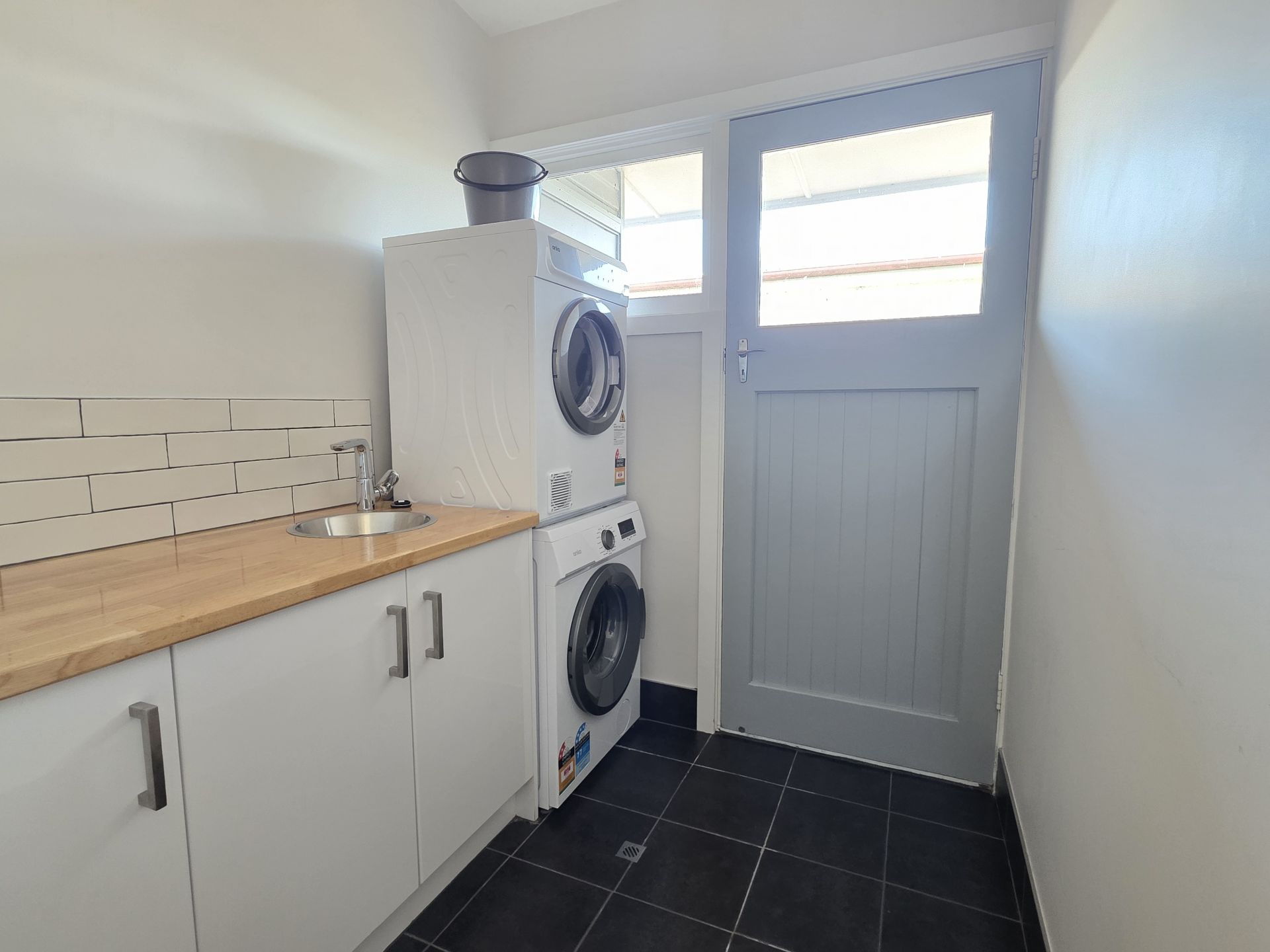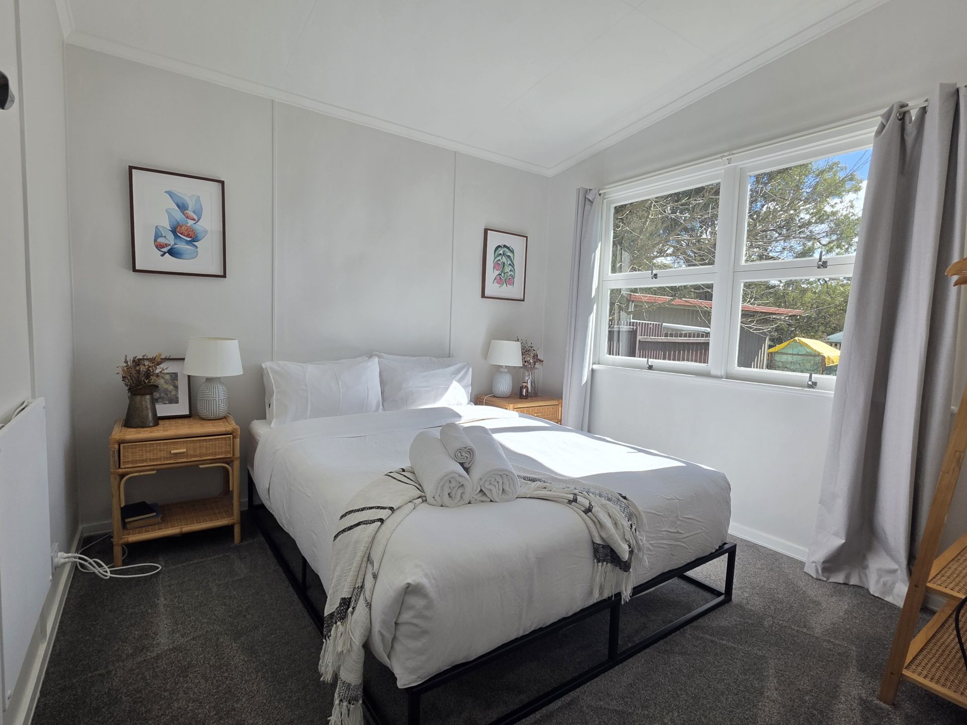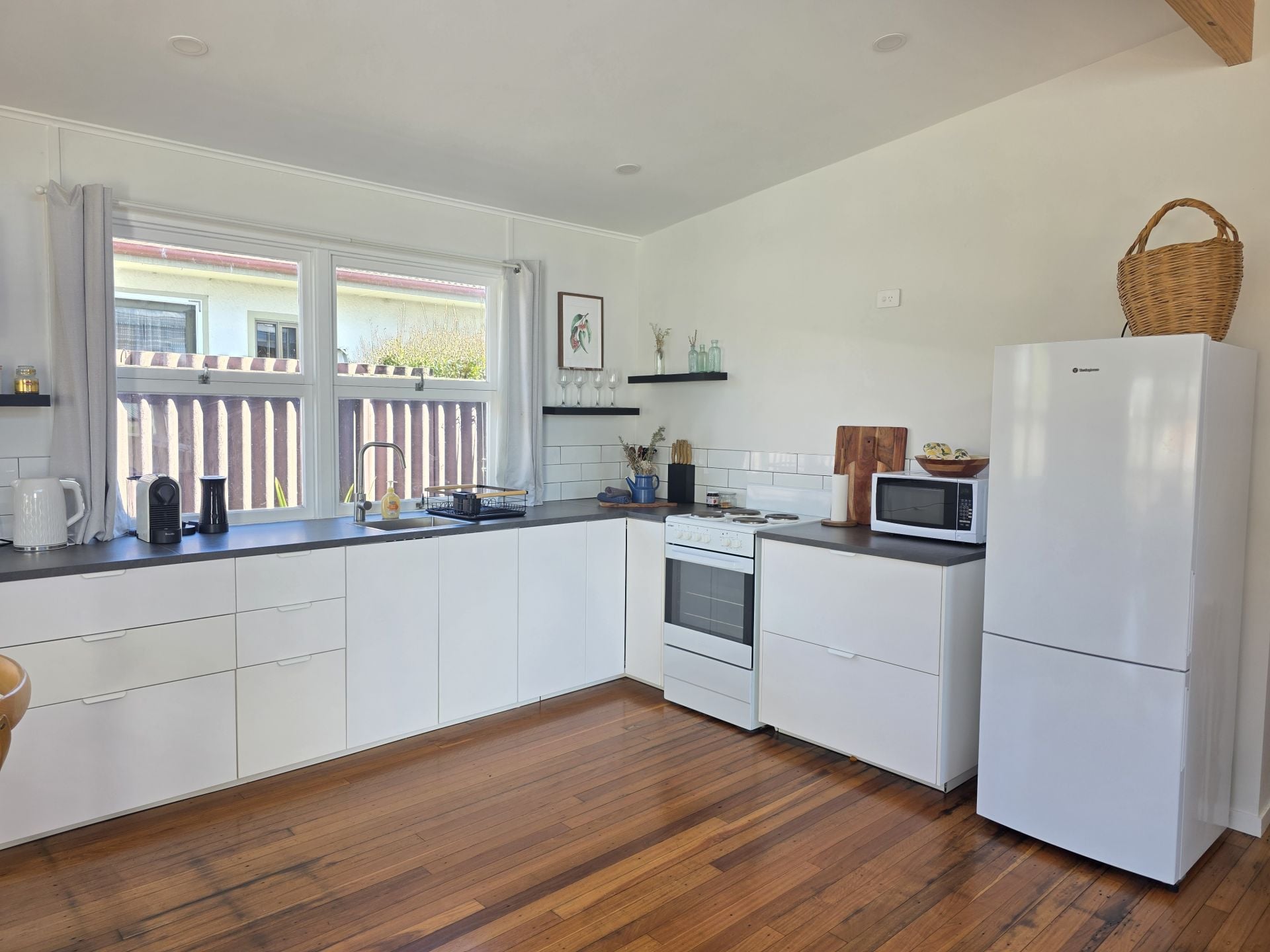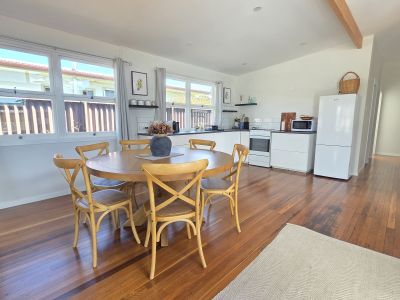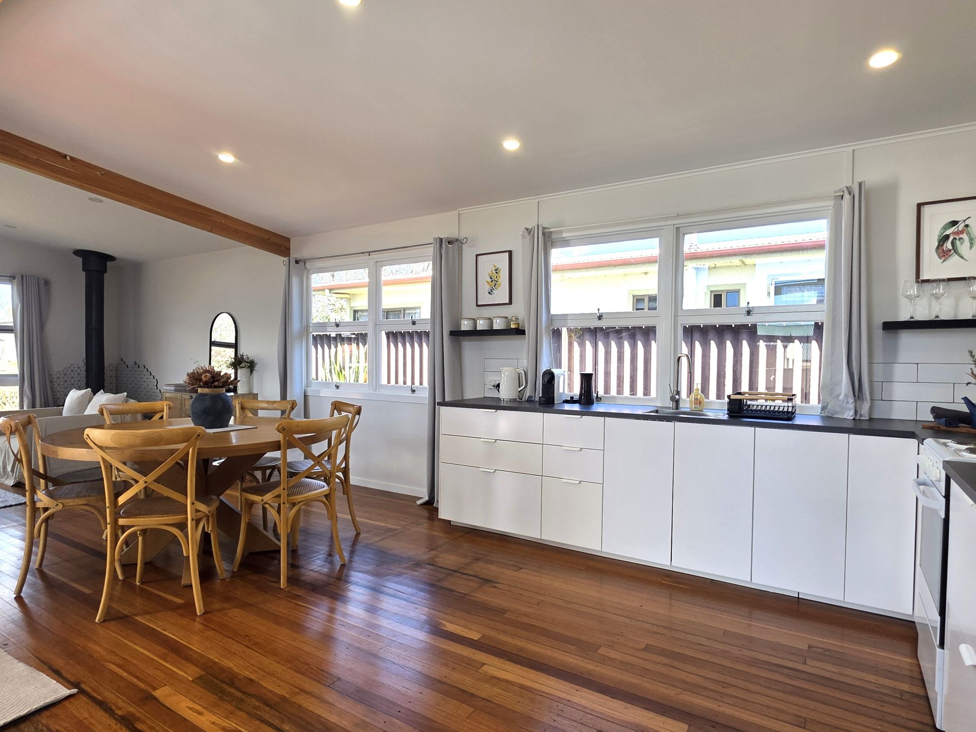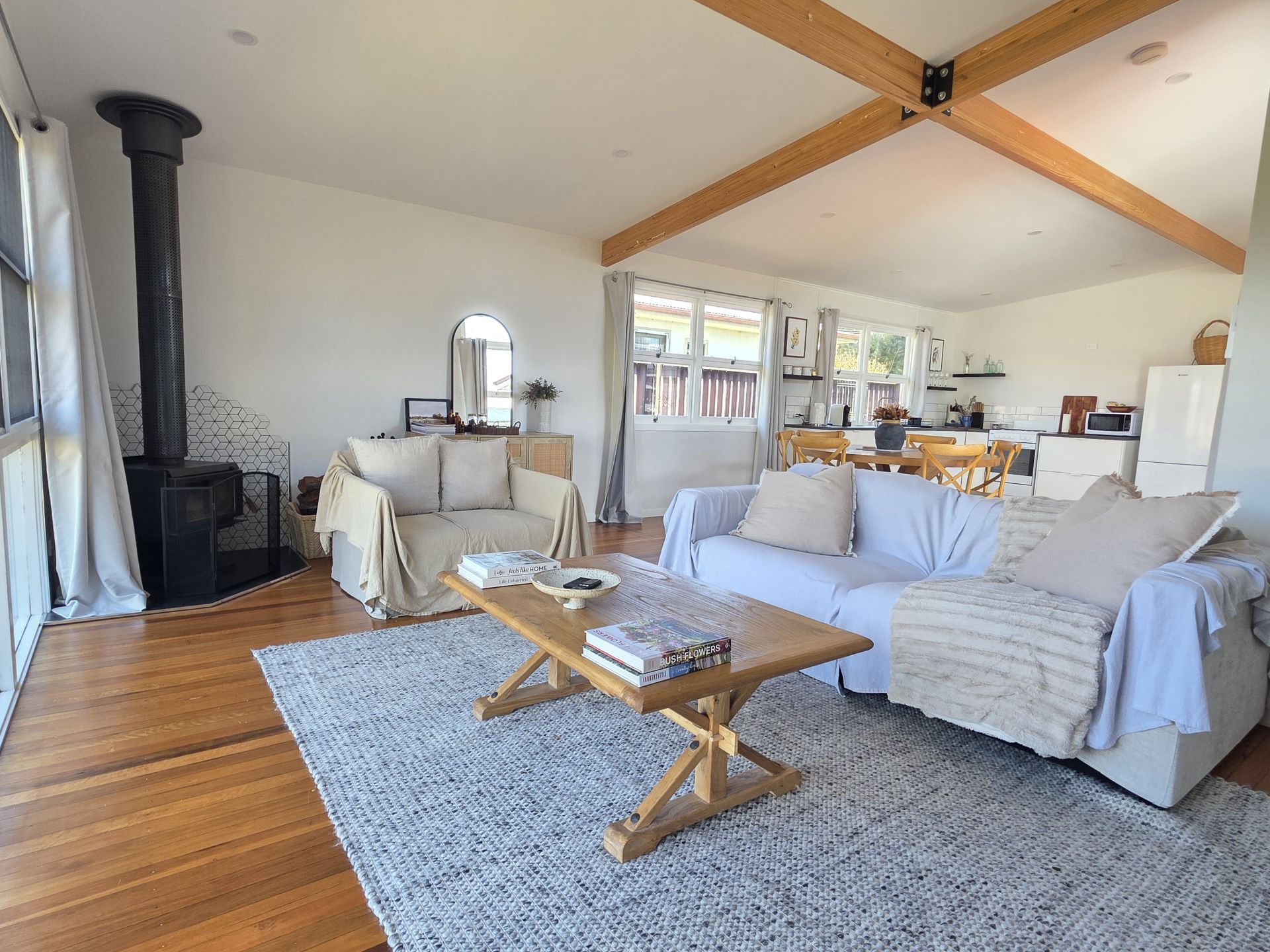 The home includes an open plan living area with exposed timber beams, and a stylish modern kitchen and a fully remodeled bathroom. Outdoors, enjoy a concrete entertaining area, single carport and spacious backyard with room for a firepit.