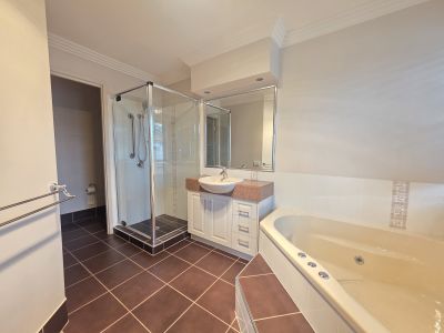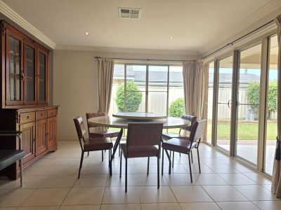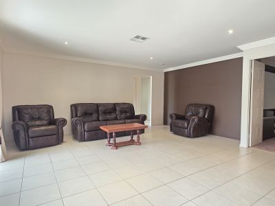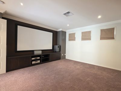 The home features four generously sized bedrooms, all with built-in robes. The master suite is well appointed with a large ensuite complete with spa bath and dressing room. Living space is impressive, with a huge open plan living and dining area complemented by a separate media room featuring a built-in projector, movie screen, and surround sound speakers.